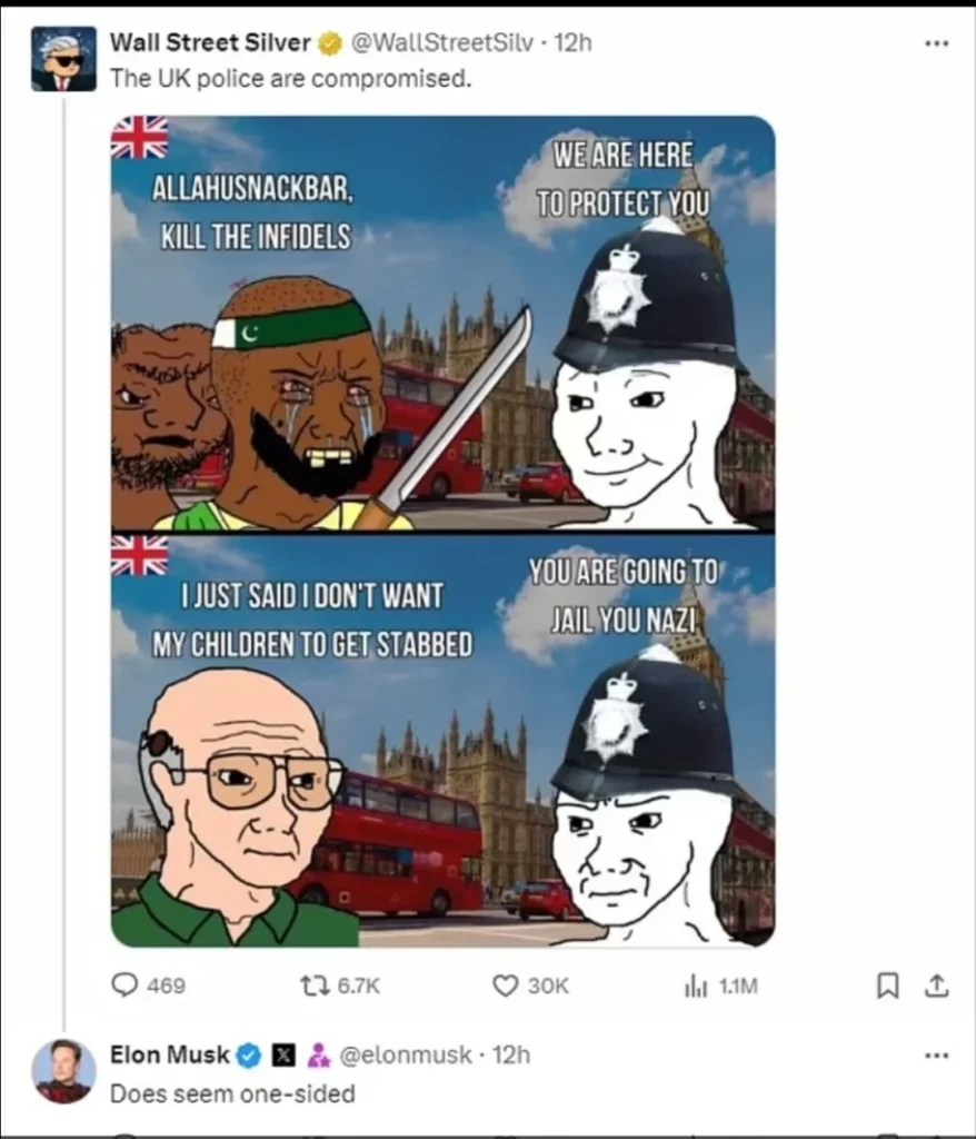 كما تضمنت المنصة “إكس” رسومًا كاريكاتورية مسيئة، أثارت جدلاً واسعًا، حيث وصف أحد المستخدمين شرطة المملكة المتحدة بأنها “معرضة للخطر”