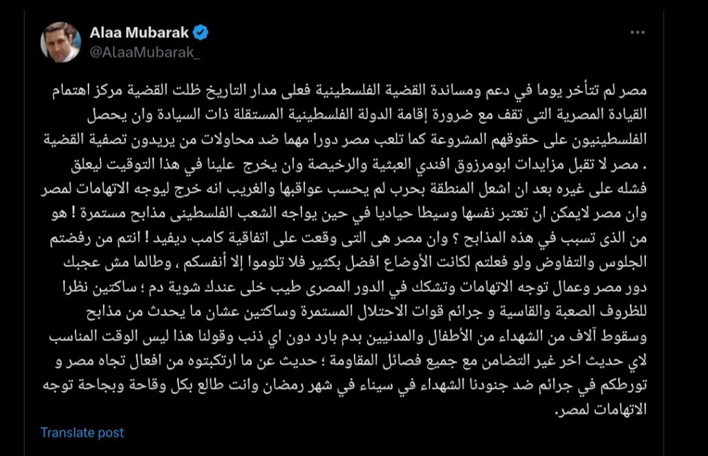 وكتب علاء مبارك عبر صفحته الرسمية على منصة إكس: “مصر لم تتأخر يوما في دعم ومساندة القضية الفلسطينية فعلى مدار التاريخ ظلت القضية مركز اهتمام القيادة المصرية التي تقف مع ضرورة إقامة الدولة الفلسطينية المستقلة ذات السيادة وان يحصل الفلسطينيون على حقوقهم المشروعة كما تلعب مصر دورا مهما ضد محاولات من يريدون تصفية القضية”.