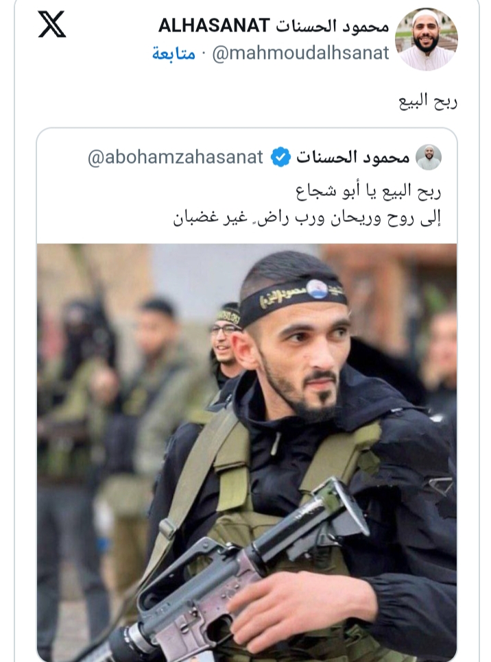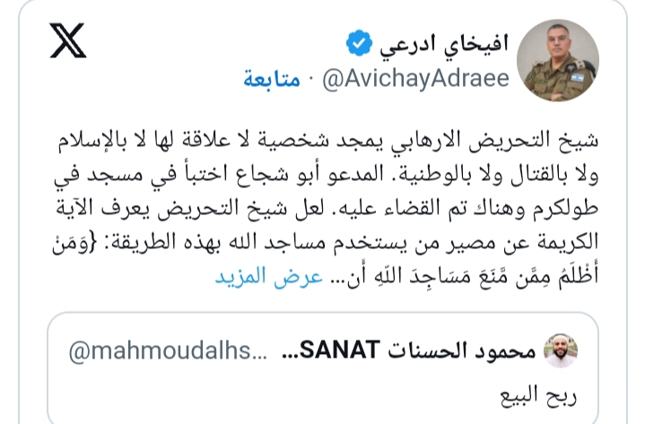 وعلق المتحدث العسكري علي تويتة الشيخ قائلا عبر حسابه على إكس: شيخ التحريض الإرهابي يمجد شخصاً ليس له علاقة لا بالإسلام ولا القتال ولا الوطنية، المدعو أبو شجاع اختبأ في مسجد في طولكرم وهناك تم القضاء عليه، لعل الشيخ المحرض علي الإرهاب، يعرف الآية الكريمة التي تحدد مصير من يستخدم مساجد الله بهذه الطريقة {ومن أظلم من من منع مساجد الله أن يذكر فيها اسمه وسعي في خرابها، أولئك ما كان لهم أن يدخلوها إلا خائفين لهم في الدنيا خزي ولهم في الآخرة عذاب أليم}.