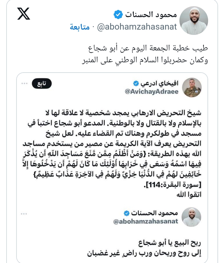 ورد الشيخ محمود الحسنات علي تدوينة متحدث الإحتلال بتدوينة علي حسابه قائلاً: طيب خطبة الجمعة اليوم عن أبو شجاع، وكمان حضربله السلام الوطني علي المنبر.