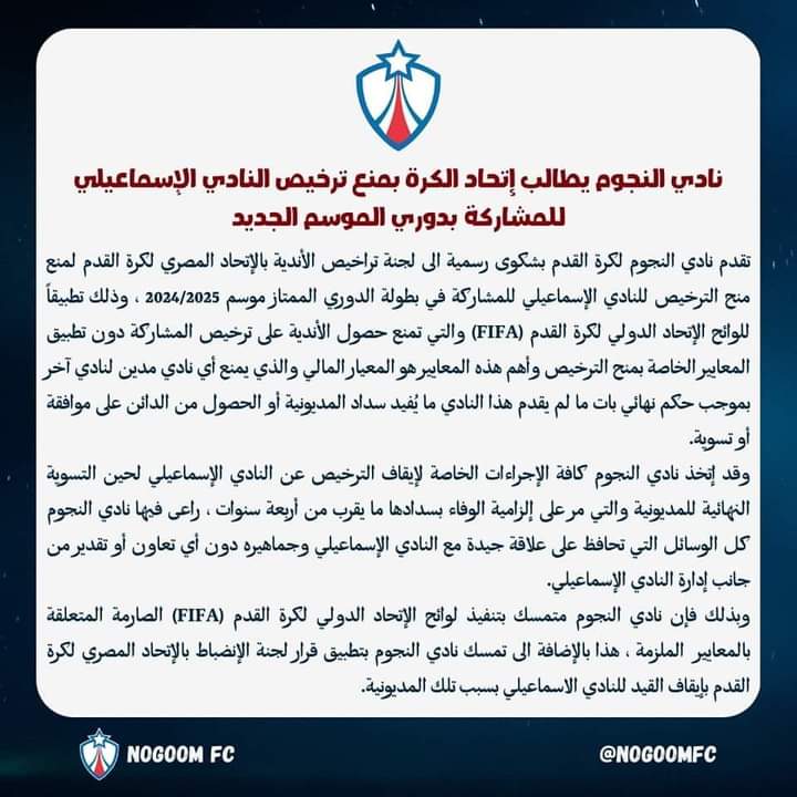 تقدم نادي النجوم لكرة القدم بشكوى رسمية الى لجنة تراخيص الأندية بالاتحاد المصري لكرة القدم، لمنع منح الترخيص لنادي الإسماعيلي للمشاركة في بطولة الدوري الممتاز موسم 2024/2025.