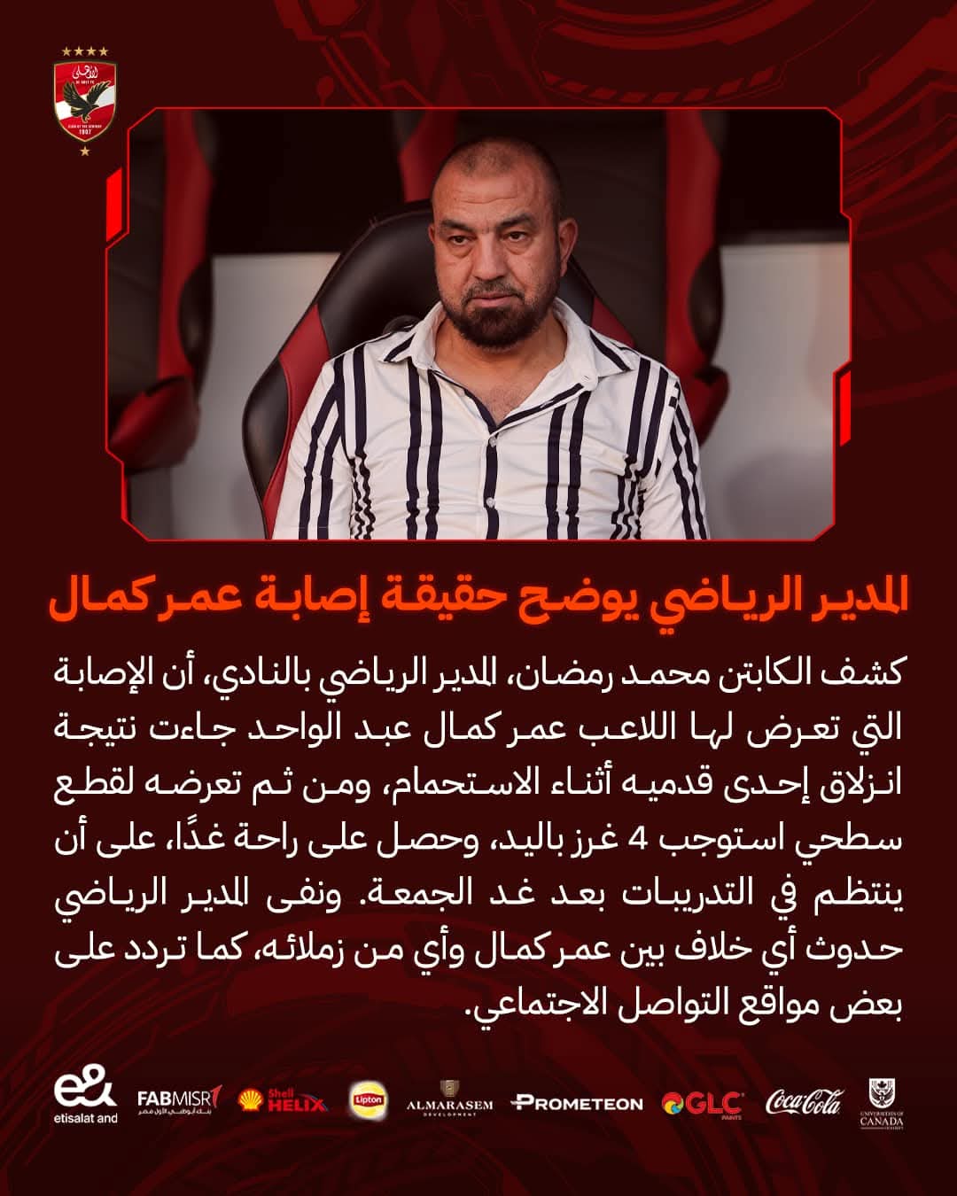 أعلن النادي الأهلي رسميًا تفاصيل الإصابة التي تعرض لها لاعبه عمر كمال عبد الواحد، والتي أثارت تساؤلات واسعة بين جماهير القلعة الحمراء في الساعات الماضية.