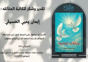 بدأت الكتابه هذا العام ولكن لديها الموهبه منذ فترةٍ طويله ولكن لم تكن الفرصه متاحه للإبداع حتي حانت الفرصه هذا العام وبدأت بأول اعمالها «رسائل إيمانيه» كتاب خواطر دينيه تتحدث فيها عن الإيمان بالله سبحانه وتعالي وجميل اقداره. والثقه فيما عنده وعظيم عوضه.. وفيه بعض الخواطر عن الصلاة وعن التوبةِ من الذنوب فيه رسائل تبعث في الروح الطمأنينه. وبعضها يوقظ النفوس ويرشدها الي السبيل الصحيح للعوده الي الله من بعد الذنب. به من التفاؤل الكثير اوجه فيه رسائلي للأشخاص الذين طال صبرهم وانتظارهم لعوض الله ولمن تغير مسار حياتهم من امنيات الي امنيات اخري.. رسائل تريح النفوس وتطمئنها بأن القادم اجمل وأنما بعد الصبر إلا عظيم الجبر.