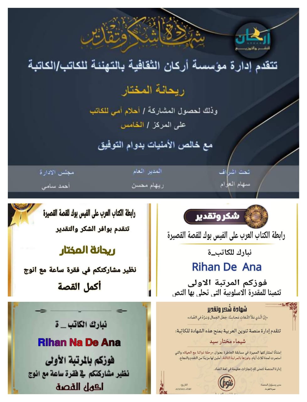 اسمي شيماء مختار سيد، المعروفة بلقب ريحانة المختار، أبلغ من العمر خمساً وعشرين سنة، حاصلة على بكالوريوس علوم ذوي الاحتياجات الخاصة من محافظة بني سويف، وأعمل كاتبة وأخصائية في اضطرابات اللغة والتخاطب.