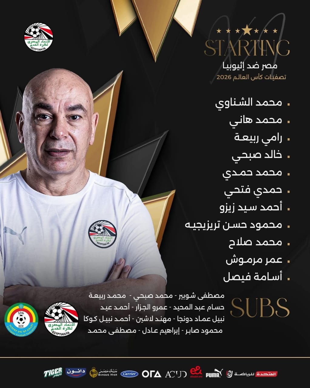 أعلن الجهاز الفني لمنتخب مصر الأول بقيادة الكابتن حسام حسن عن التشكيل الرسمي الذي سيخوض مواجهة إثيوبيا مساء اليوم، ضمن منافسات الجولة الأخيرة من التصفيات المؤهلة لكأس العالم 2026