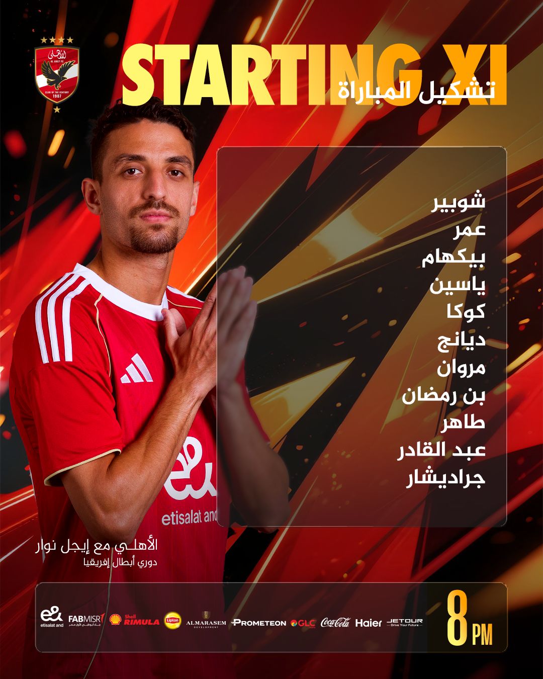 أعلن الجهاز الفني للنادي الأهلي عن التشكيل الرسمي الذي سيخوض به مباراة الإياب المصيرية أمام إيجل نوار البوروندي في دور الـ 32 من دوري أبطال أفريقيا، ويدخل الأهلي اللقاء بهدف وحيد هو تحقيق الفوز لضمان التأهل إلى دور المجموعات، بعد انتهاء مباراة الذهاب بانتصار صعب (1-0).