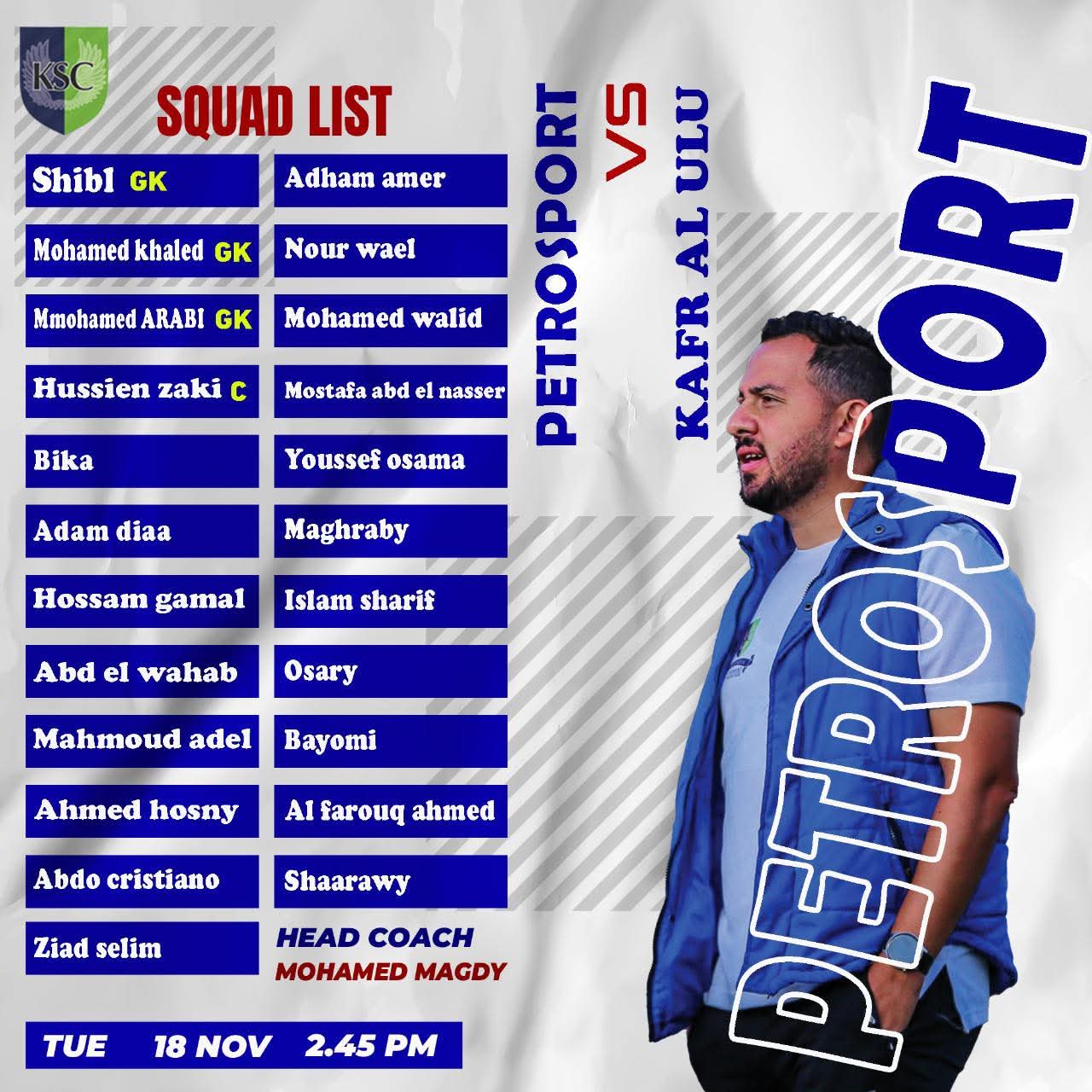 أعلن فريق بترو سبورت بقيادة كابتن محمد مجدي المدير الفني للفريق ،قائمة اللاعبين الذين سيخوضون مباراة الغد أمام كفر العلو، ضمن الجولة الثامنة من دوري الدرجة الرابعة، وذلك في إطار السعي لمواصلة الانتصارات وتعزيز نقاط الفريق في جدول الترتيب.