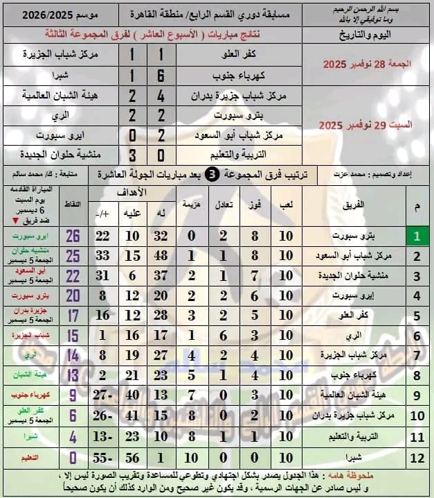 شهدت الجولة العاشرة بالمجموعة الثالثة في دوري الدرجة الرابعة مواجهات حماسية ومثيرة، حيث قدمت الفرق عروضًا قوية، وسجلت مباريات الجمعة والسبت أهدافًا كثيرة وتبادلت الفرق السيطرة، ما جعل ترتيب الصدارة لا يزال مفتوحًا أمام المنافسة الشرسة بين الفرق .
