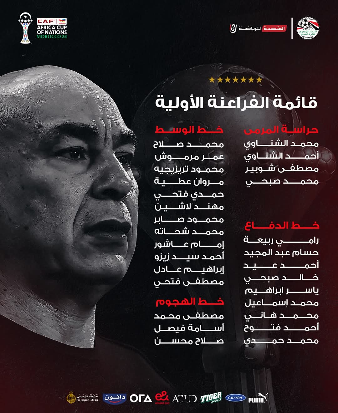 أعلن الجهاز الفني لمنتخب مصر الأول لكرة القدم، بقيادة حسام حسن، القائمة الرسمية لمعسكر ديسمبر استعدادًا لخوض منافسات كأس الأمم الإفريقية 2025 المقرر إقامتها في المغرب، ويأتي المعسكر ضمن البرنامج النهائي للفراعنة قبل انطلاق البطولة، بهدف رفع جاهزية اللاعبين الفنية والبدنية.