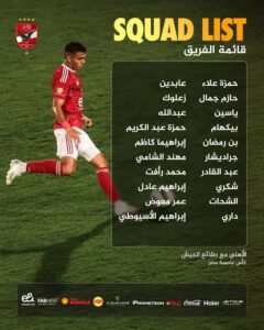حمزة علاء، حازم جمال، ياسين مرعي، أحمد رمضان بيكهام، محمد علي بن رمضان، نيتس جراديشار، أحمد عبد القادر، محمد شكري، حسين الشحات، أشرف داري، عابدين، محمد زعلوك، محمد عبد الله، حمزة عبد الكريم، إبراهيما كاظم، مهند الشامي، محمد رأفت، إبراهيم عادل، عمر معوض، إبراهيم الأسيوطي.