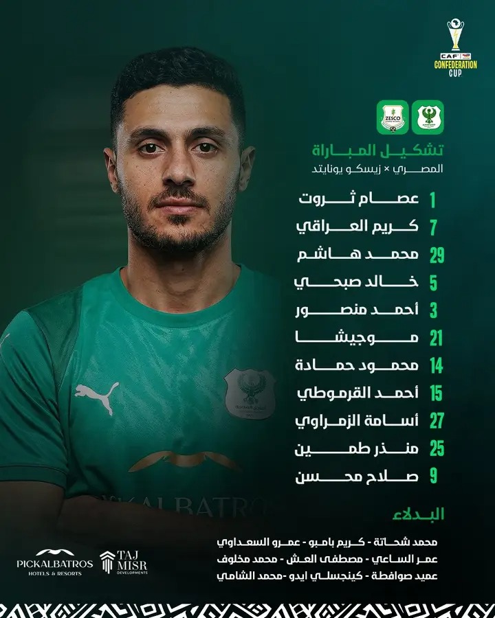 أزاح التونسي نبيل الكوكي، المدير الفني للنادي المصري، الستار عن التشكيل الرسمي لفريقه استعدادًا لمواجهة زيسكو يونايتد الزامبي، في اللقاء الذي يُقام على ملعب السويس الجديد ضمن منافسات الجولة السادسة والأخيرة من دور المجموعات لبطولة كأس الكونفدرالية الإفريقية.