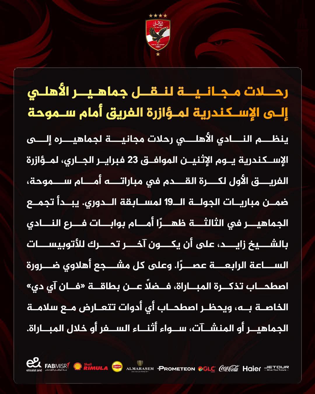 أعلن النادي الأهلي تنظيم رحلات مجانية لجماهيره إلى مدينة الإسكندرية، لمؤازرة الفريق الأول لكرة القدم في مواجهته المرتقبة أمام سموحة، ضمن منافسات الجولة التاسعة عشرة من بطولة الدوري المصري الممتاز.