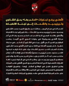 وفي سياق متصل، شدد النادي الأهلي في خطابه على أنه “لن يتهاون في الحفاظ على حقوق لاعبيه الأدبية والمعنوية”، مشيراً إلى أن العلاقة بين الحكم واللاعب يجب أن تقوم على الاحترام المتبادل، وأن دور الحكم هو ضبط الملعب بالقانون وليس الدخول في مشاحنات أو توجيه إساءات.