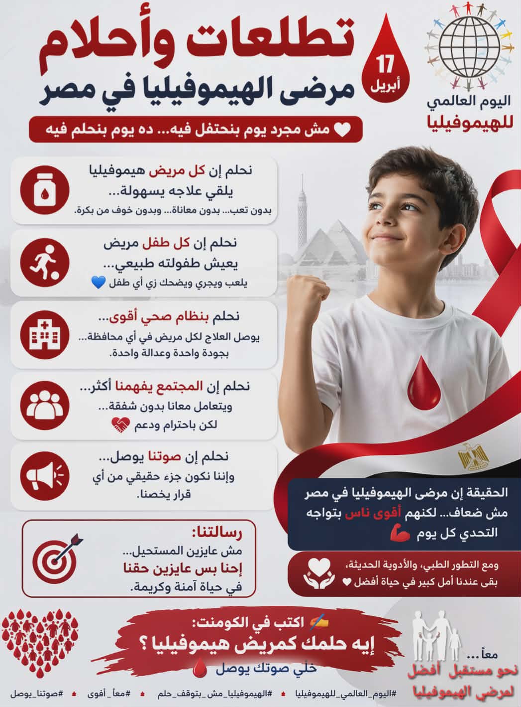 تطلعات وآمال مرضى الهيموفيليا في مصر بمناسبة اليوم العالمي للهيموفيليا وهذا اليوم ليس مجرد مناسبة للاحتفال، بل هو يوم نحلم فيه.